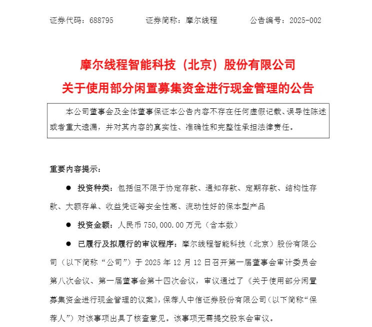 12月12日晚间,有“中国版英伟达”之称的“国产GPU第一股”摩尔线程(688795.SH)发布公告称,拟使用不超过75亿元的部分闲置募集资金进行现金管理,引发广泛关注。