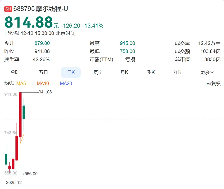 12月12日,摩尔线程大幅回调,一度重挫逾19%,最终跌13.41%,累计涨幅仍超过613%。