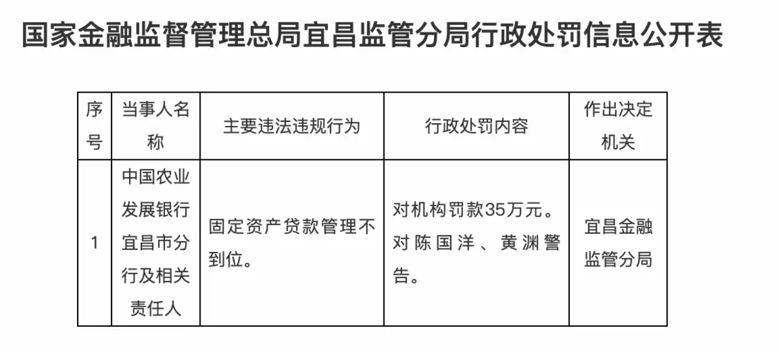 农发行宜昌市分行被罚款35万元 因固定资产贷款 球哥 • 2025-12-16 10:45 • 阅读 12月12日,据国家金融监督管理总局官网消息,农发行宜昌市分行已固定资产贷款管理不到位被罚款35万元,相关责任人陈国洋、黄渊受到警告。 文章来源互联网。发布者:球哥,转转请注明出处:/a/yingxiao/370.html