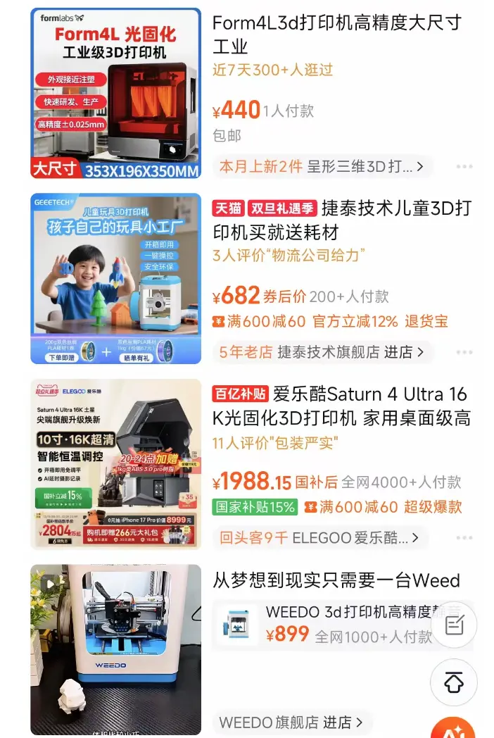 第二是设备成本的降低。曾几何时,一台3D打印机价格普遍在2万元以上。而现在,主流消费级打印机价格已降至1500至8000元区间,入门级设备甚至只需几百元。数据显示,入门级设备比三年前便宜了六成以上。2025年一季度,全球售出的超100万台入门级3D打印机中,95%来自中国公司。